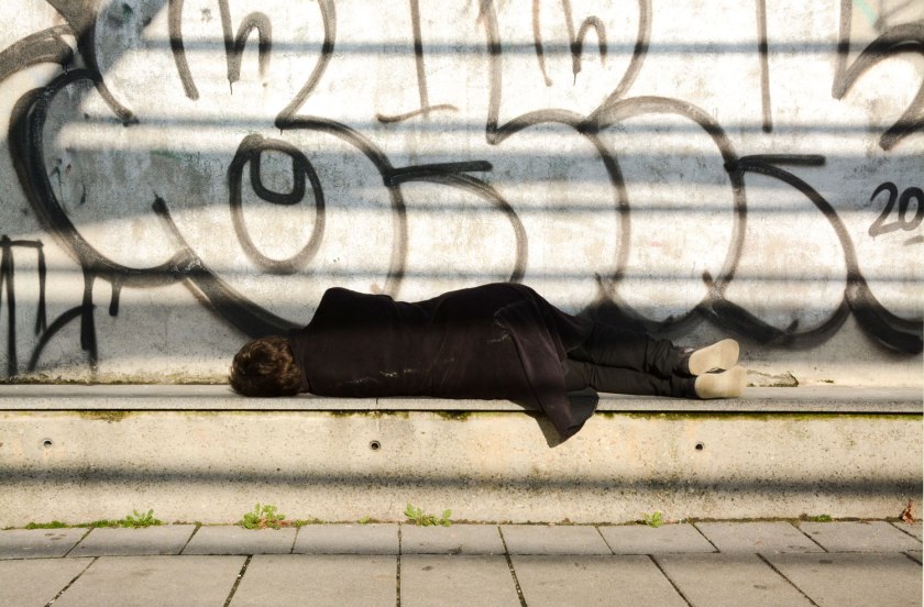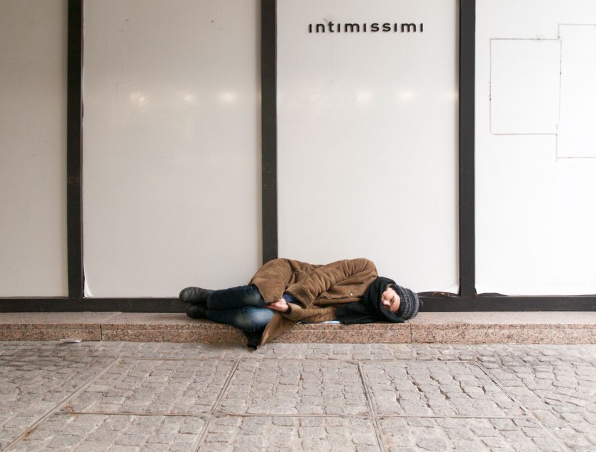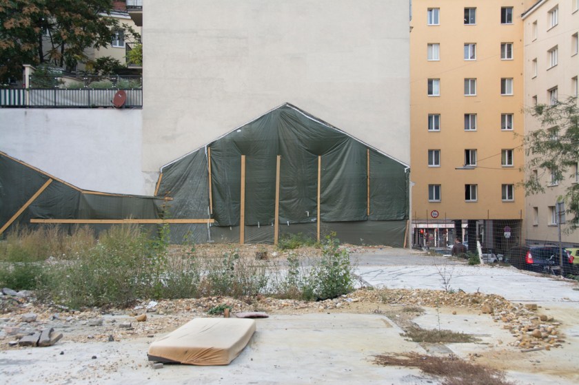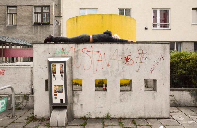 Nun könnte man testliegen auf der Mariahilferstraße, denn das Liegen in der Öffentlichkeit hat was Obszönes und soll durch das Design der Sitzmöbel verhindert werden, das Design hat diese Schlacht gegen das Sein gewonnen, da hilft keine Muttergottes. Denn Menschen, die auf der Straße einfach SIND, die sie nicht in Anpeilung der Arbeitsstätte oder für einen Einkaufszwischenstopp durchqueren, interpretieren die Öffentlichkeit auf so irritierende Weise, dass man sie am Dortsein hindern muss. Bettelnde, auf der Straße sitzende und liegende Menschen gehören zur Realökonomie dieses finanztechnisch auf Vordermann getrimmten Europa, doch statt in Ausbildung und Beschäftigungsprojekte investiert man lieber in Sicherheitsdesign: Ordnungswachen und Liegeverunmöglichungskonstruktionen. Auf dem nackten Boden kann man sich aber immer noch niederlassen, der Schwerkraft folgen, ausstrecken. Vor Lüftungsgittern, in deren Winkeln sich der Dreck festgebacken hat, in zugigen Durchgängen kann man das ruhig Daliegen üben, sich konzentrieren auf das gleichmäßige Geräusch ankommender Schritte, auf das vielleicht folgende Zögern, manchmal auch Innehalten, das entschiedene Weitergehen. Vielleicht wird man beschnüffelt von mitgeführten Haustieren, Ratten, angepeilt von zielgenauen Tauben oder Krähen?